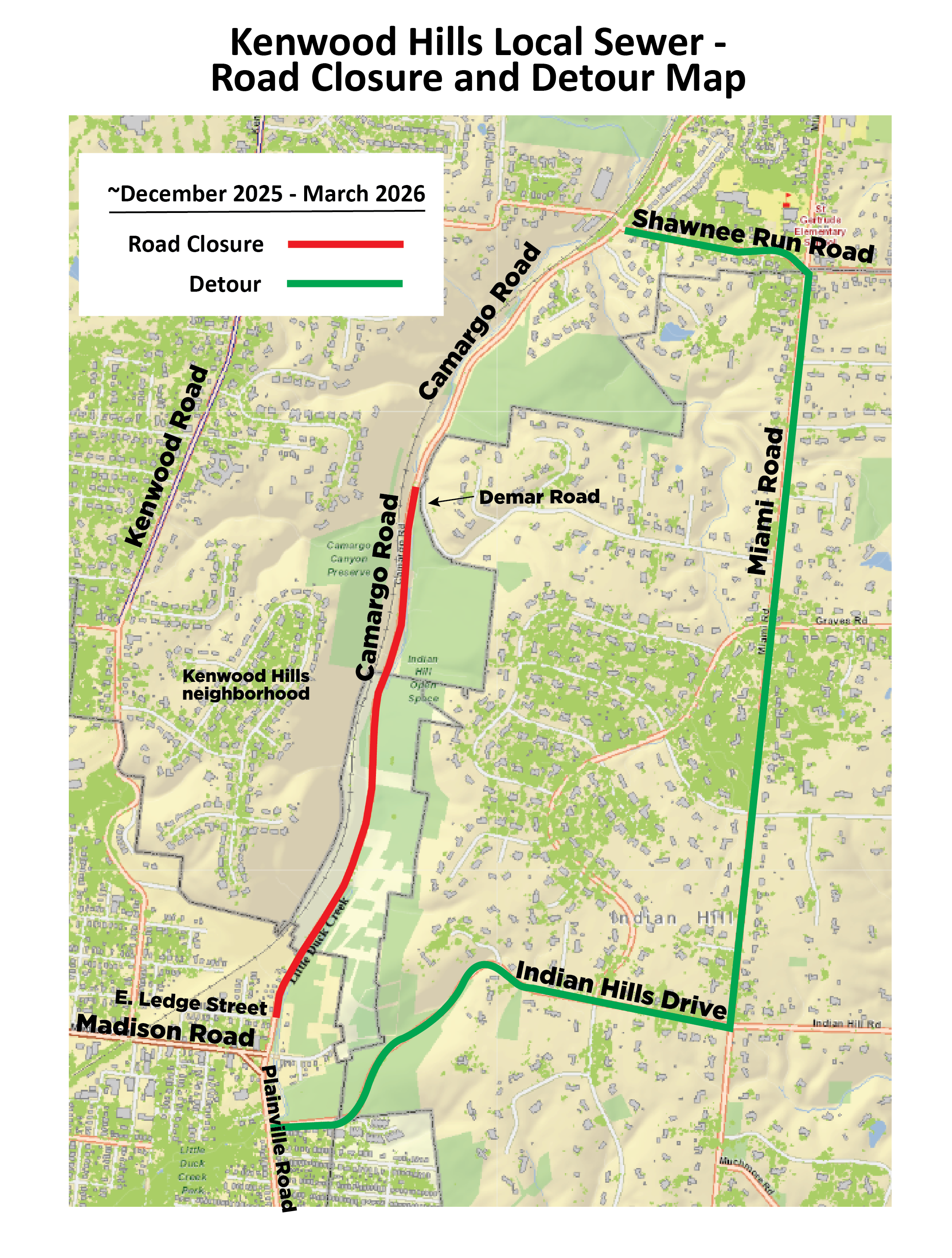 Camargo Road in Madeira will be closed to thru traffic between Demar Road and East Ledge Street from early November through spring 2026. Local access to homes will be maintained. The detour is via Shawnee Run Road to Miami Road to Indian Hills Road and vice versa.