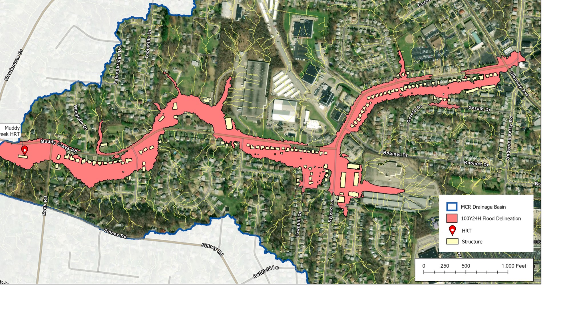 The $4 million in grant funding, along with an additional $1.5 million from MSD in local cost share, was used to purchase and demolish up to 31 flood-prone properties along Muddy Creek Road between Glenway Avenue and Westbourne Drive. The homes in this area have been prone to overland flooding and sewer backups for years. They were constructed in the 1950s in and along a former creek bed of Muddy Creek which was enclosed in a sewer to allow the development. The area is recognized by FEMA as an equivalent 100-year floodplain of Muddy Creek.
